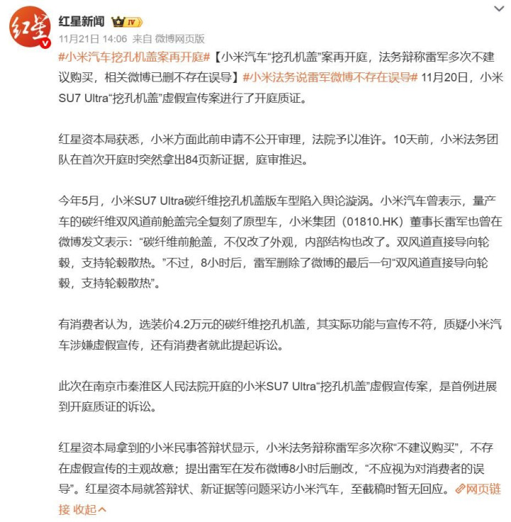 《都市新闻》在11月17日的报道中表示,新证据中新增了多项关键说法,包括“雷军不懂结构,发的微博不算数”“4.2万的配件不算买车关键因素”“机盖的导流散热不是刚需”等。目前,该报道及相关稿件已不可见。
