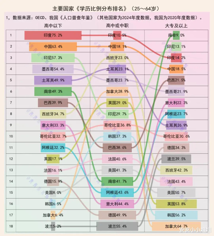 至于代表高等教育普及度的“大专及以上”学历,我国占比为18.5%。这一数据在图表国家中处于中游,高于印度、南非、印尼等国,但显著低于美国(50.7%)、加拿大(64.7%)、日本(数据未直接显示但通常很高)等发达国家,也低于英国、法国、波兰等国。