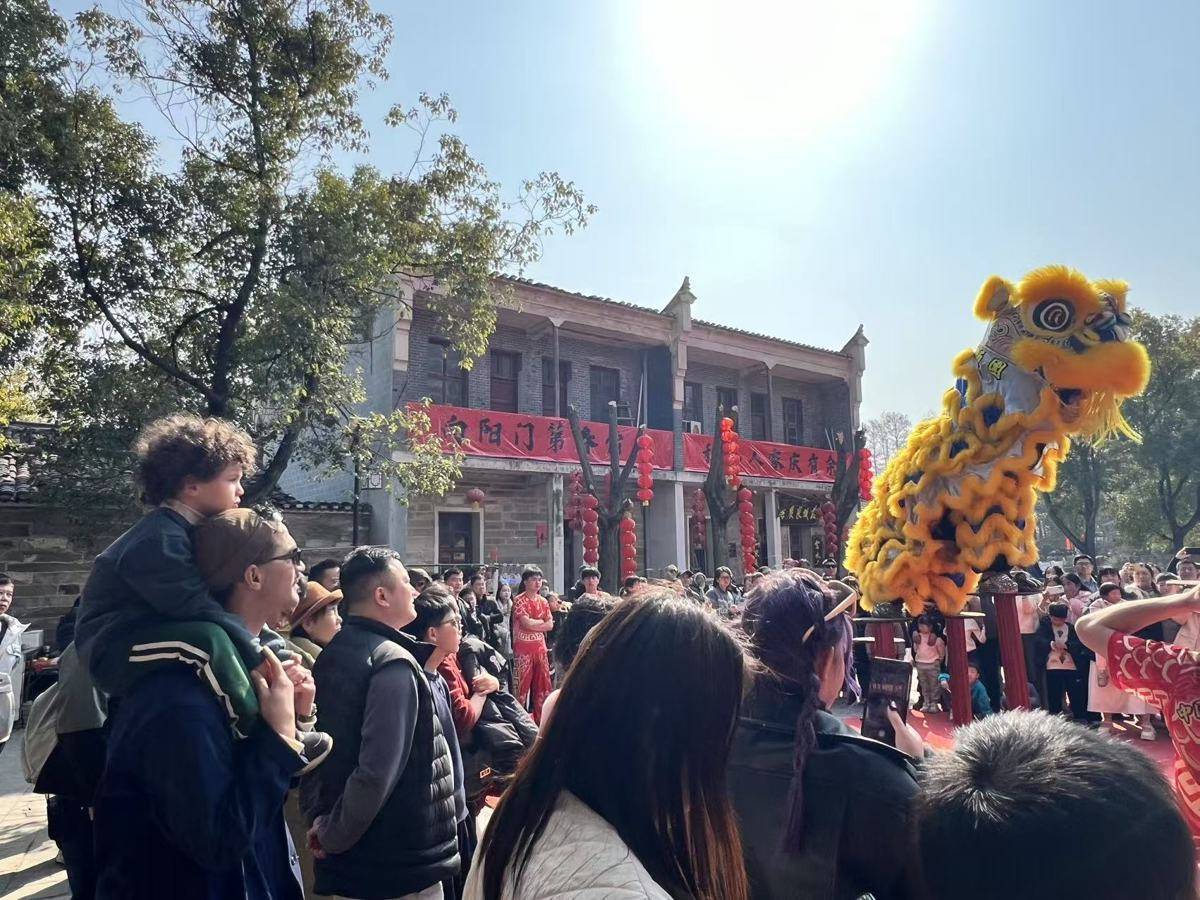 “咚咚锵!咚咚锵!”下午两点,广场上锣鼓喧天、人声鼎沸。在阵阵欢呼声中,大余湾古村龙狮队闪亮登场,龙狮踩着梅花桩腾转挪移、灵动翻飞,精彩表演引得现场掌声雷动。龙狮表演结束后,川剧变脸、皮影戏、木偶戏等非遗节目,也在古村接连上演,让游客大饱眼福。