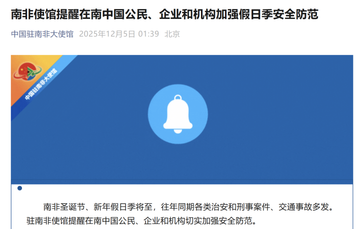 12月5日,中国驻南非大使馆发文:南非圣诞节、新年假日季将至,往年同期各类治安和刑事案件、交通事故多发。驻南非使馆提醒在南中国公民、企业和机构切实加强安全防范。