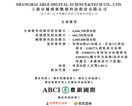 据招股书,上海卓越睿新数码科技股份有限公司H股发行最终定价为每股67.50港元,共发行6666700股,其中90%为国际发售,10%为香港公开发售。