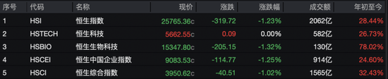 12月8日,恒生指数收跌1.23%,报25765.36点;恒生科技指数收平,恒生中国企业指数收跌1.25%。全日大市成交额为2062亿港元,南向资金净买入金额为15.40亿港元。